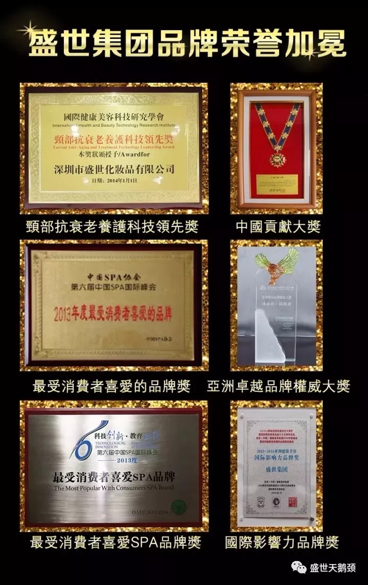 盛世品牌憑借卓越的品質(zhì),獲美業(yè)權(quán)威機(jī)構(gòu)、專家、廣大消費(fèi)者的一致認(rèn)可;曾榮獲“2016年度生活美容品牌企業(yè)獎(jiǎng)”,“2016年度最佳供應(yīng)商大獎(jiǎng)”,“2015中國(guó)貢獻(xiàn)大獎(jiǎng)”,“2014亞洲卓越品牌權(quán)威大獎(jiǎng)”,“2013最受消費(fèi)者喜愛品牌獎(jiǎng)”等多項(xiàng)大獎(jiǎng)。